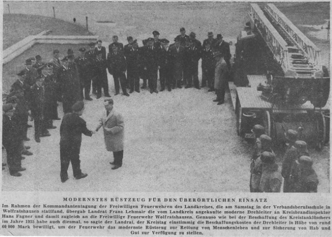 Übergabe der neuen Kraftfahr-Drehleiter am14. April 1962 durch Landrat Lehmair an KBI Fagner