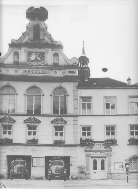 Unterbringung der Feuerwehrfahrzeuge im Rathaus (Fotomontage von W. Tutsch)